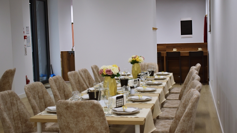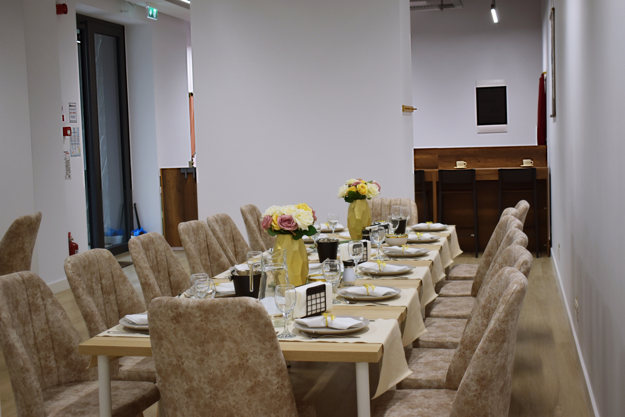Un colț cald cu tejghea, gustări și băuturi, unde poți sta aproape de copil și interacționa cu alți părinți. Funcțional, dar prietenos.
